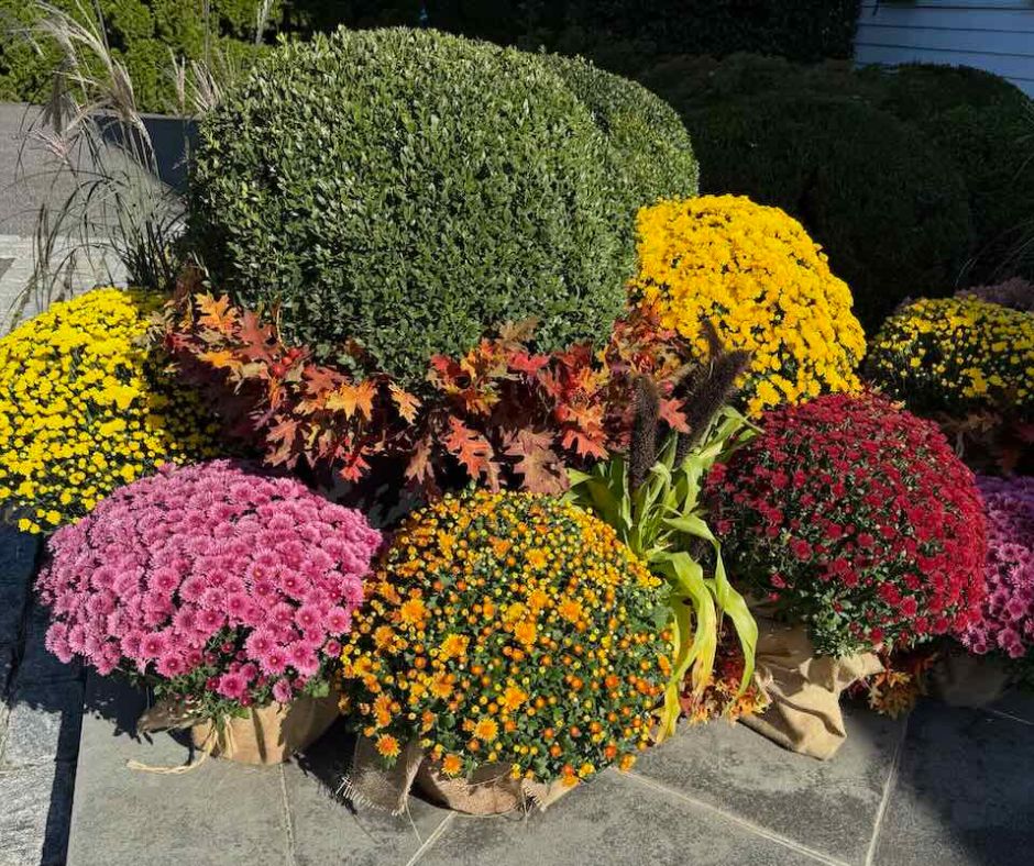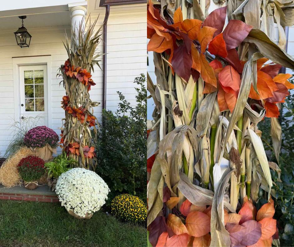 In 2024, Megyn decided to try a scaled down version of the autumnal display in an effort to prevent the damage, but her efforts were futile. After Strud went to town snacking on all the small- to medium-sized gourds dotting the yard, Megyn further went back to basics with a simpler – and less scrumptious – display of corn-less corn stalks and mums. Here’s the before and after: