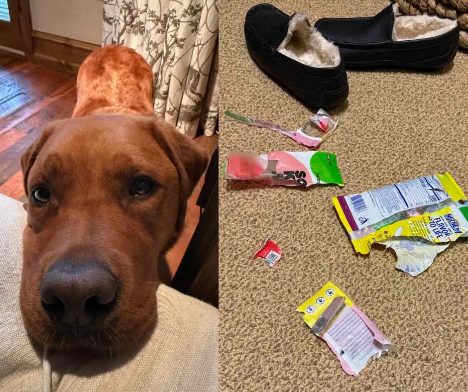 She shooed him away only to hear him dining on a dessert in Thatcher’s room next door, eating an entire bag of Hi-Chews (remnants above).