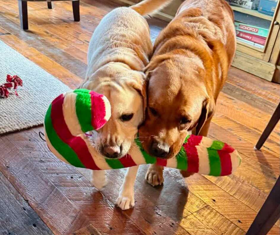 “So, our friend went hunting for Christmas stocking loot on Christmas morning and came up with a treasure. Yardley found him nose-deep in her stocking eating her Swedish candy and a chocolate-covered pretzel bite.