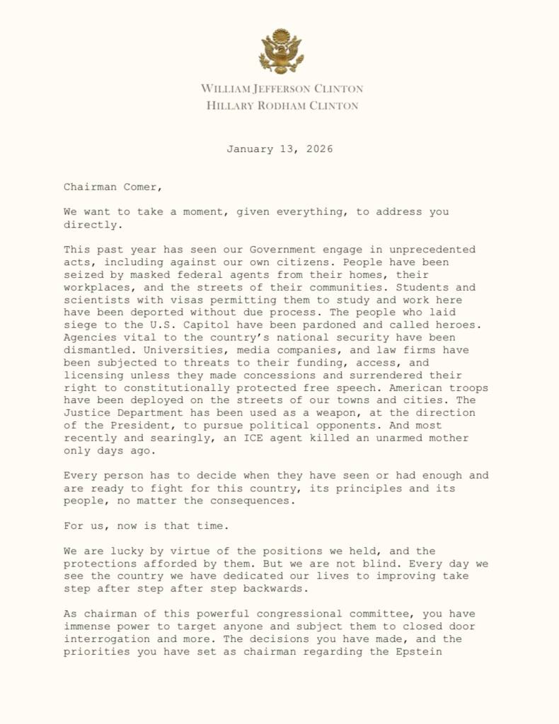 Hillary was deposed for about six hours on Thursday. In her opening statement, she said: “I do not recall ever encountering Mr. Epstein, I never flew on his plane or visited his island, homes or offices. I have nothing to add to that… You have compelled me to testify, fully aware that I have no knowledge that would assist your investigation, in order to distract attention from President Trump’s actions and to cover them up despite legitimate calls for answers.”