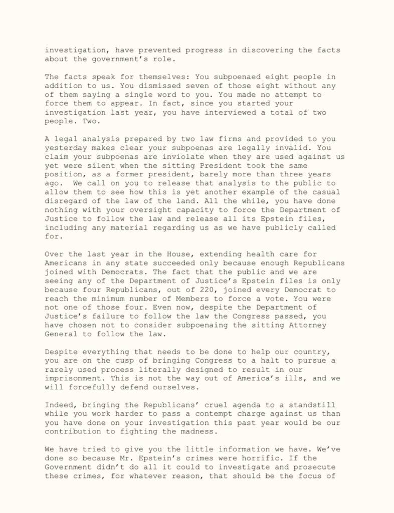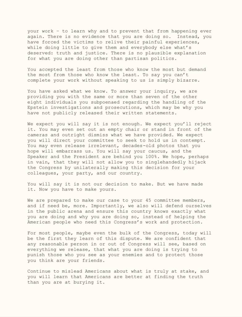 You need to read the entire letter because it is the most absurd self-aggrandizing thing you will ever see. It waxes poetic about all the reasons it is so unjust they were calling them in there to testify, and how terrible this government is, and why they will fight. They will be the ones. They have the wherewithal. They have the means. Give it a read: