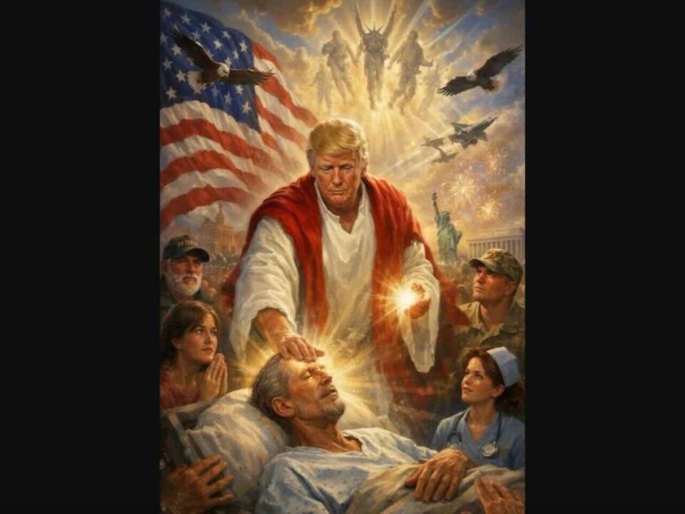The image, which the president first posted late Sunday and deleted Monday morning, featured a rendering of Trump draped in a white and red robe and standing in a Christ-like pose while placing a hand over a sick man lying in a hospital bed. In the foreground, a woman observed the healing scene with her hands steepled in prayer; in the background, the American flag, Statue of Liberty, and bald eagles were interspersed with demonic-looking figures.