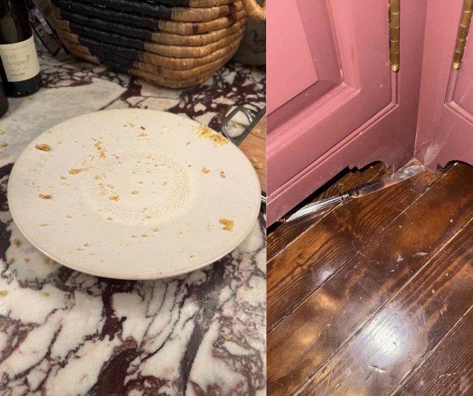 Upon returning home, I first noticed the remnants of Yardley’s birthday cake – which, notably, had been outside of the dogs’ closed-in perimeter – were gone with the knife on the floor.