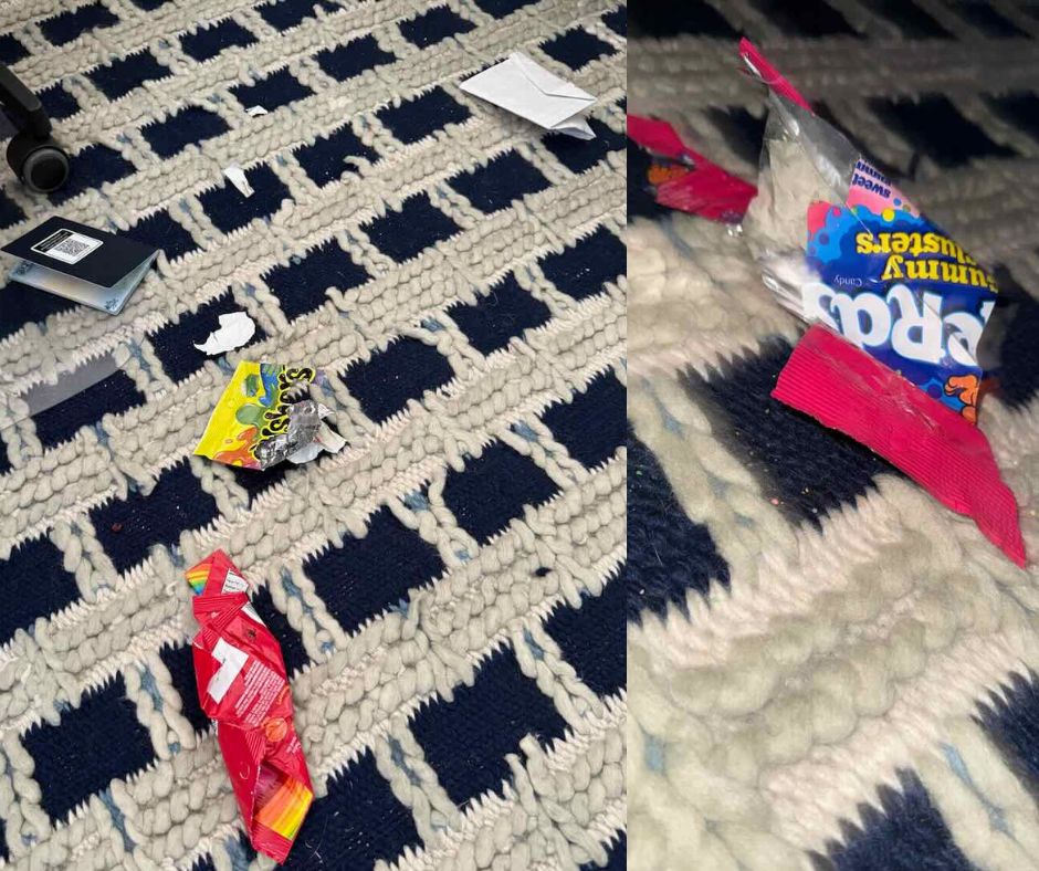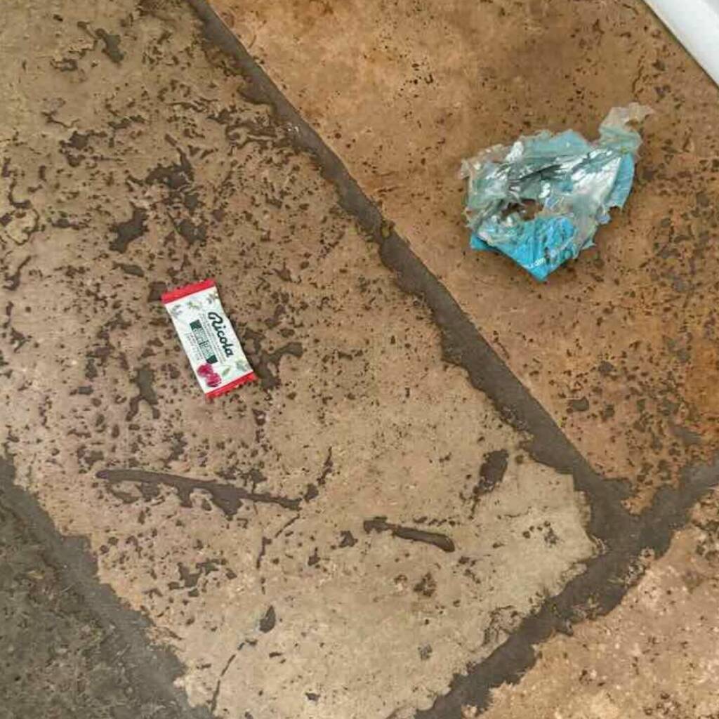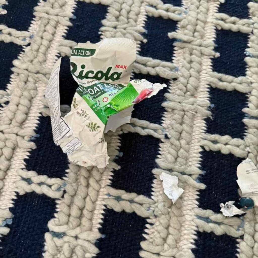 We also found more evidence of Strud’s love of the Ricola, which, I must say, is a new discovery. These findings came the next day, which leads me to believe it was a new caper. But we couldn’t figure out how he got this stuff nor what the one wrapper is even from, so it’s a mystery.