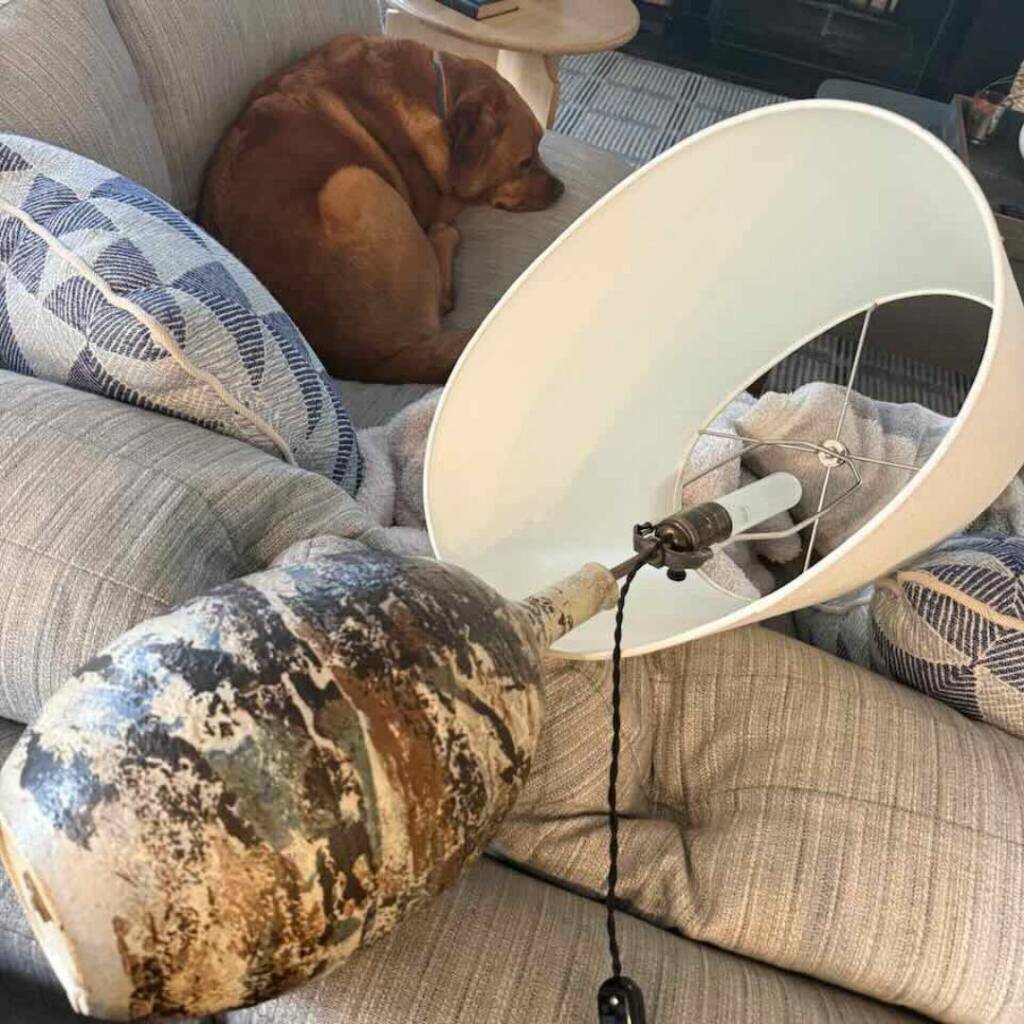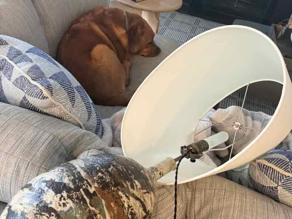 Downstairs, we found more shrapnel (and a certain someone trying to act like nothing was wrong).